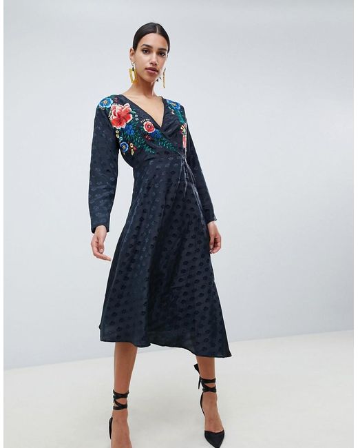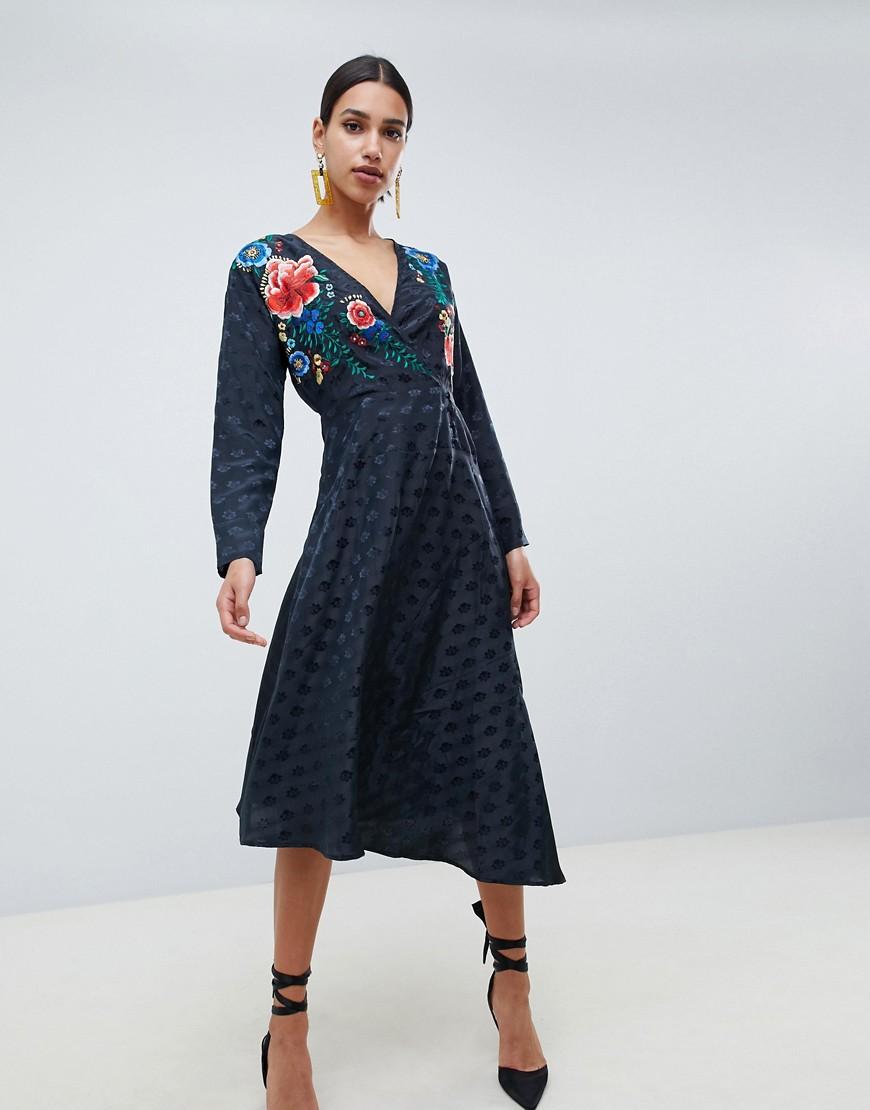 Vestito midi a portafoglio in jacquard con maniche lunghe e ricami da donna di colore nero
