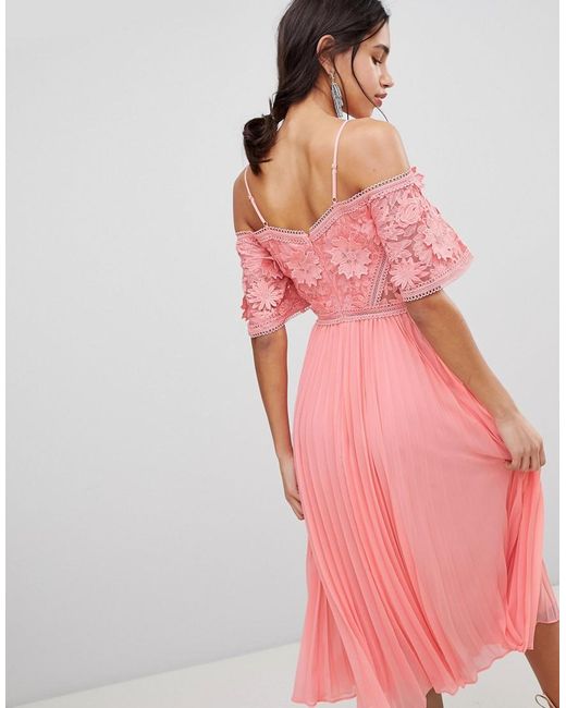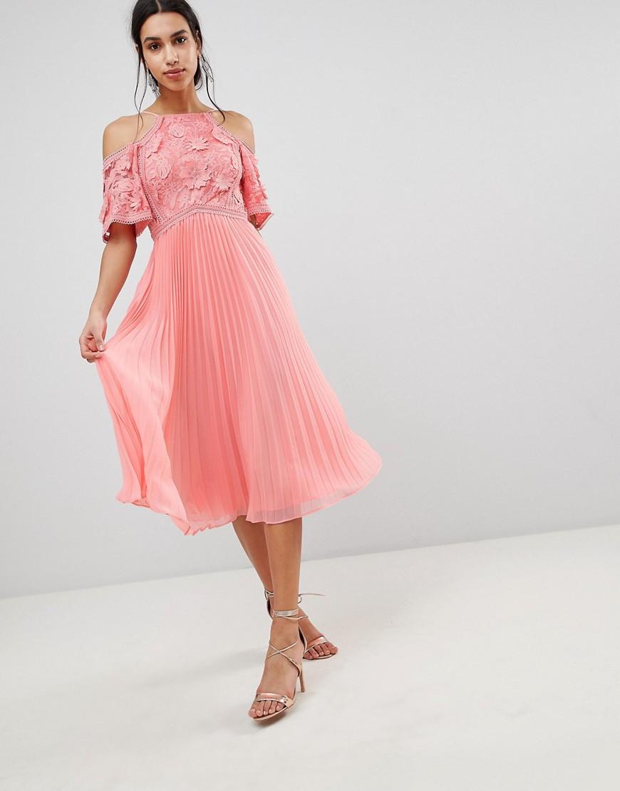 Vestito midi con top in pizzo guipure e gonna a pieghe da donna di colore rosa