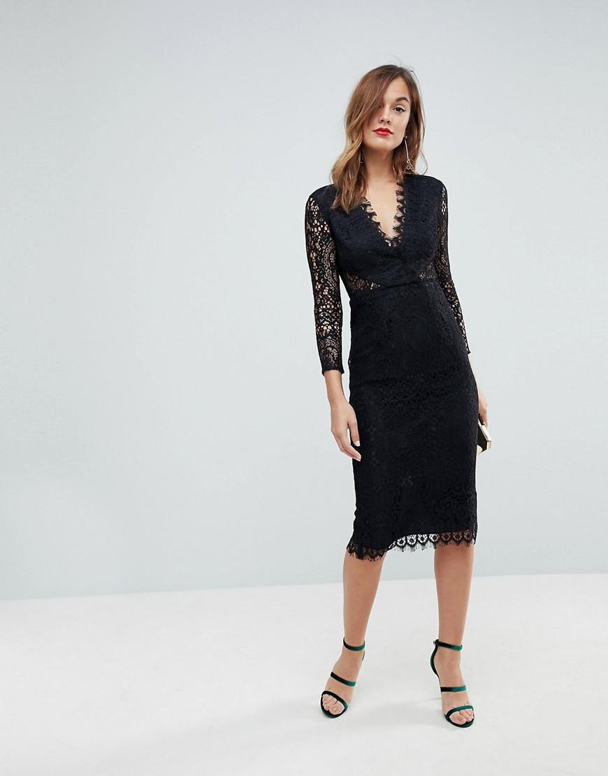 Vestito midi in pizzo a maniche lunghe da donna di colore nero