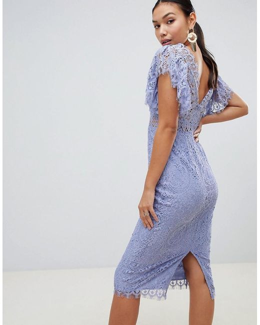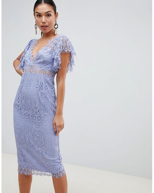 Vestito midi in pizzo con maniche a volant da donna di colore blu