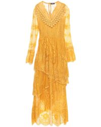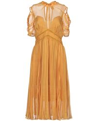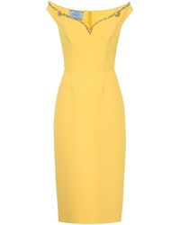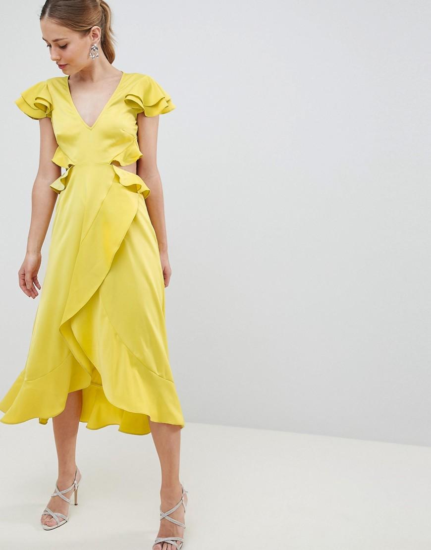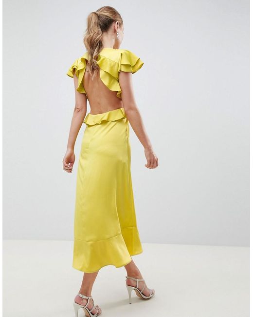 Vestito midi in raso increspato con cut-out sul retro e volant da donna di colore giallo