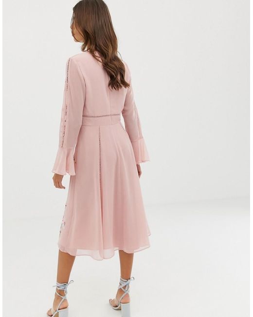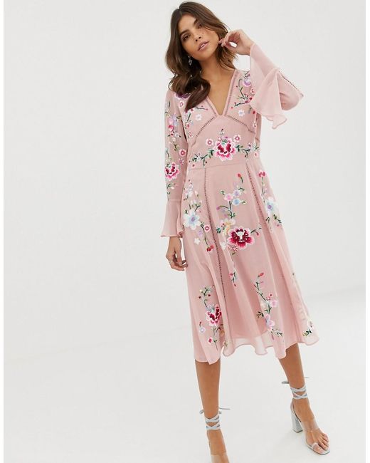 Vestito midi di ASOS DESIGN, Sì, ci piace, Scollo a V, Maniche lunghe con polsini a volant, Motivo floreale ricamato, Non una semplice stampa, Chiusura con zip sul retro, Vestibilità classica, Veste perfettamente la taglia indicata. Grazie al suo design team londinese, ASOS DESIGN interpreta con carattere le tendenze del momento, per donarti la sicurezza di cui hai bisogno per esprimere la tua individualità. Abbiamo tutti i jeans, i vestiti, le giacche e gli accessori che ti servono, disponibili anche nelle taglie Curve, Tall, Petite e Maternity. Dai anche uno sguardo alla linea make-up ASOS DESIGN. Inventa uno stile tutto tuo oggi, e ricomincia da capo domani. Perché ogni giorno e sera siano straordinari, proprio come te. La tua vita è eclettica e anticonvenzionale e, da oggi, lo sarà anche il tuo guardaroba. Jeans/ poliestere/ stampa/ viscosa. Colore: rosa
