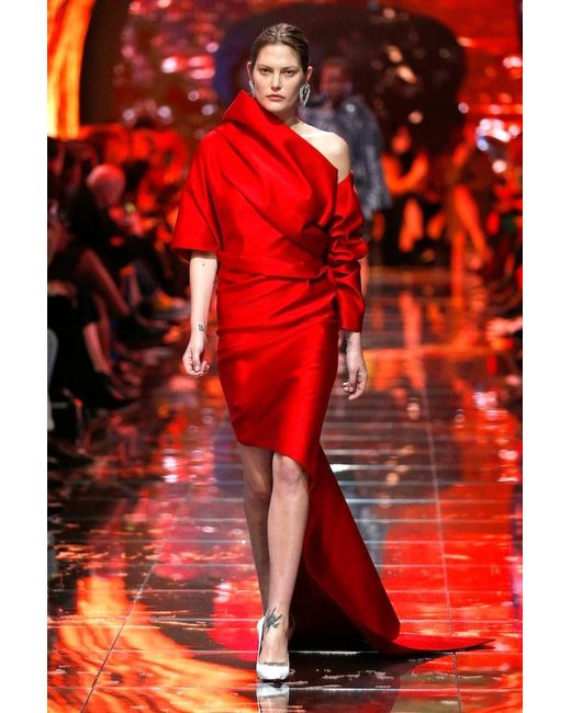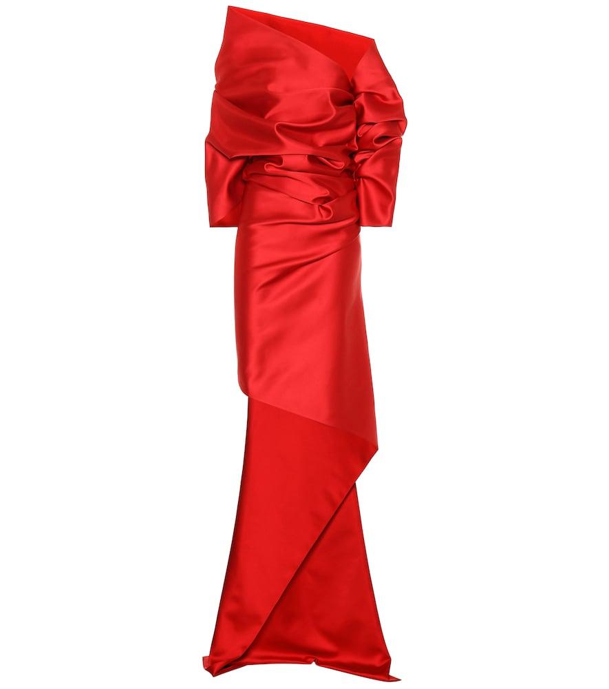 Per un look da tappeto rosso scegliete l'abito in raso doppiato firmato Balenciaga: in tinta rosso fuoco, è realizzato in Francia con una silhouette dall'effetto drappeggiato con strascico. Colore: rosso