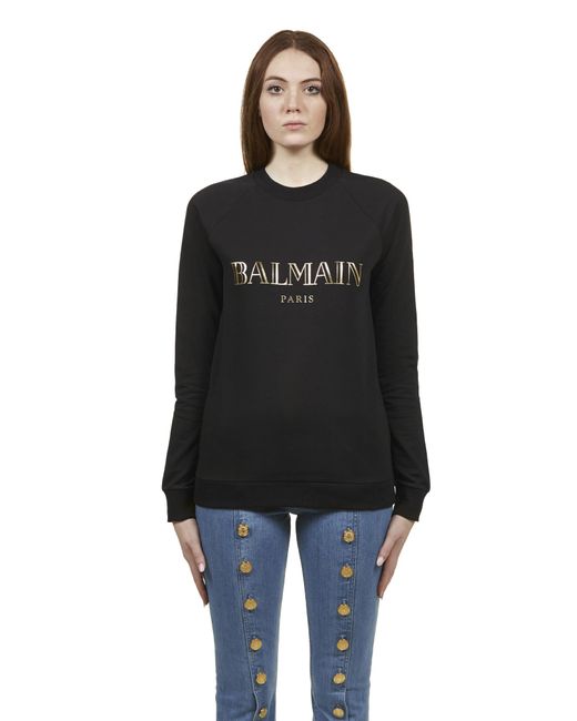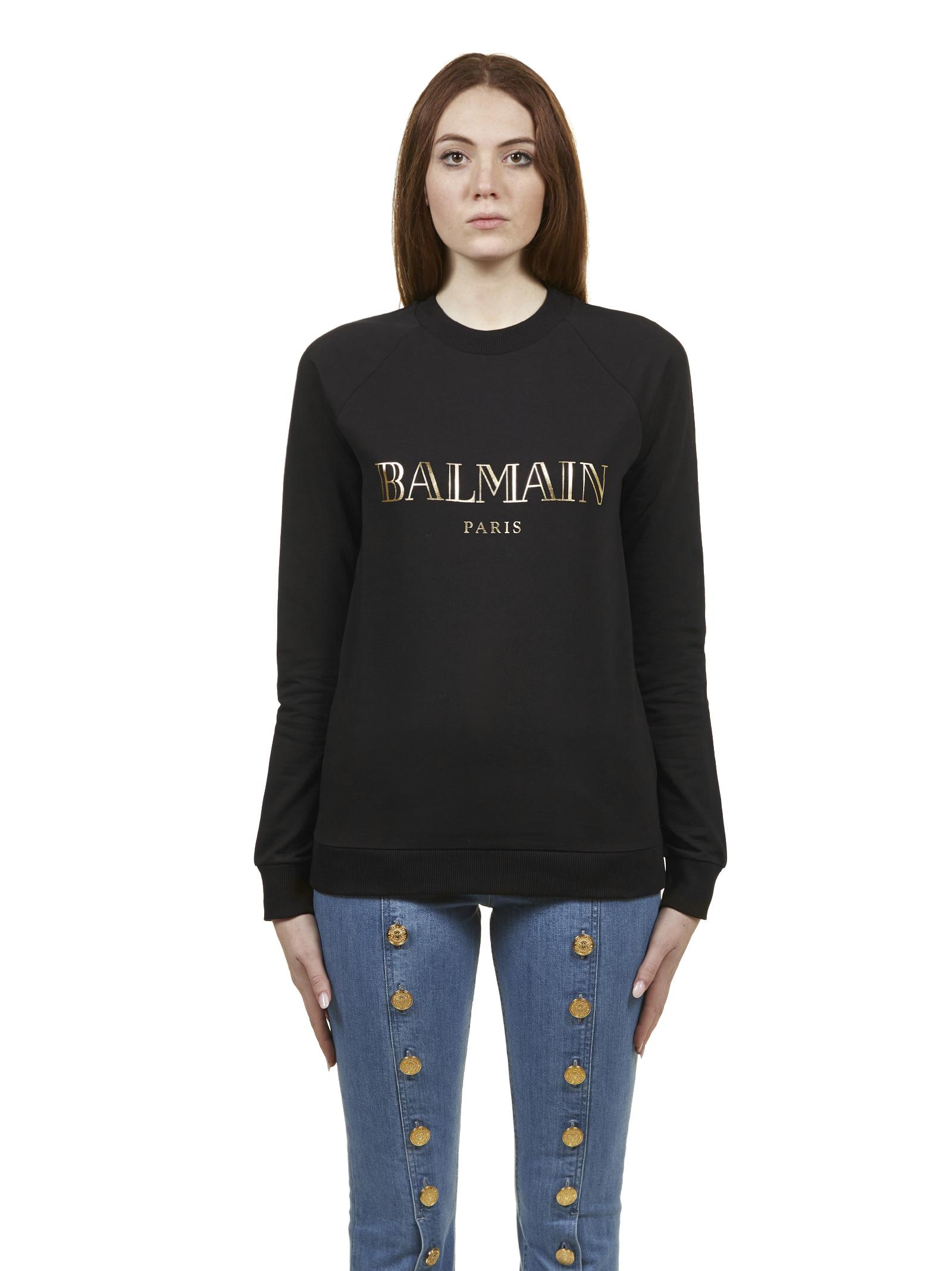 La felpa con logo di Balmain e' un modello con giroccolo con orlo a costine e maniche lunghe. Caratterizzato dal logo del brand di colore oro sulla parte frontale del capo. Colore: nero