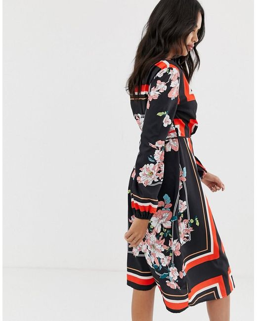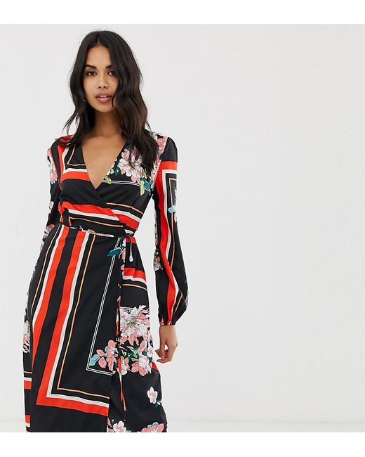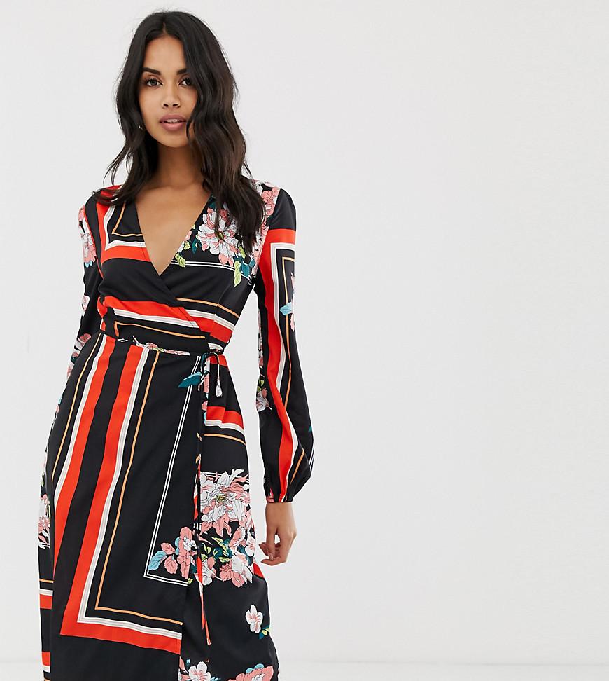 Vestito midi a portafoglio con stampa mista a fiori e righe da donna