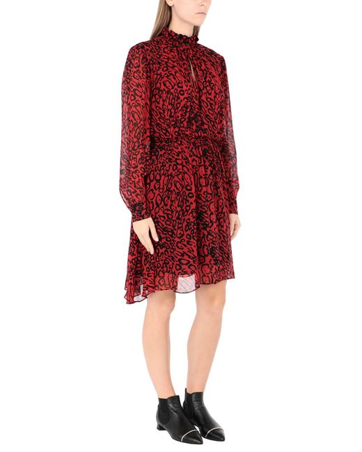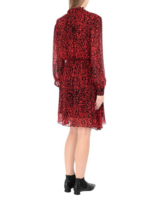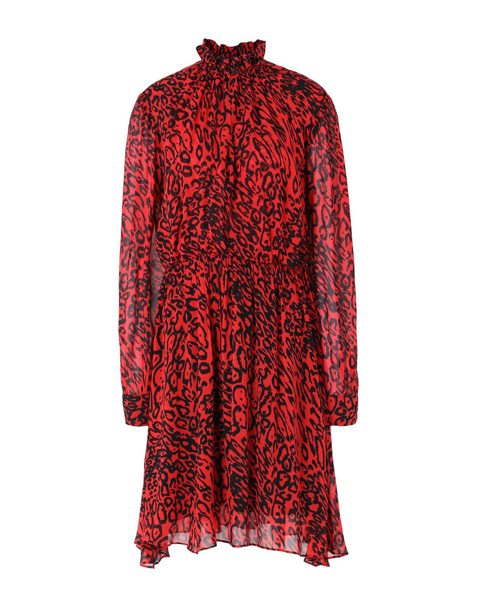 Crêpe, pieghe, logo, fantasia leopardata, collo tondo, maniche lunghe, polsini con bottoni, chiusura sul fianco, zip, interno foderato. 100% Viscosa. Colore: rosso