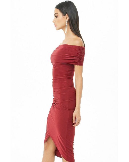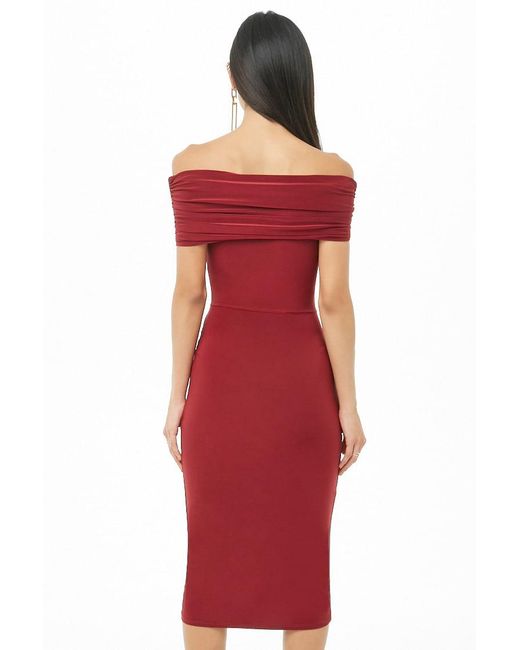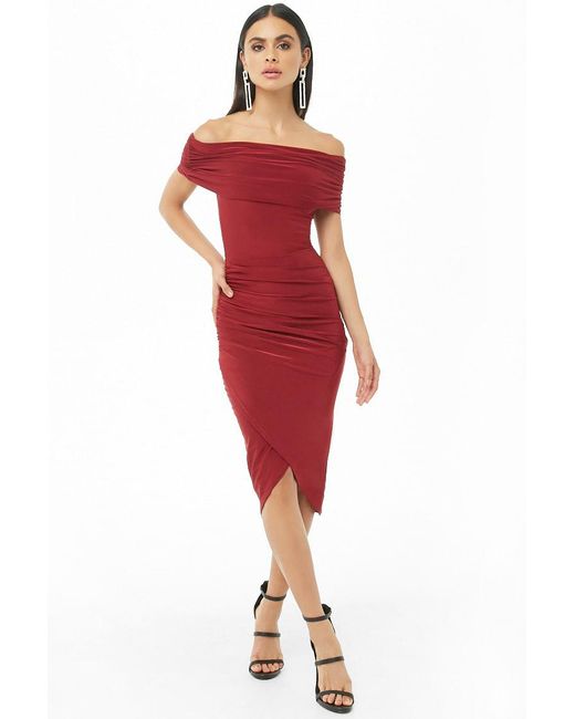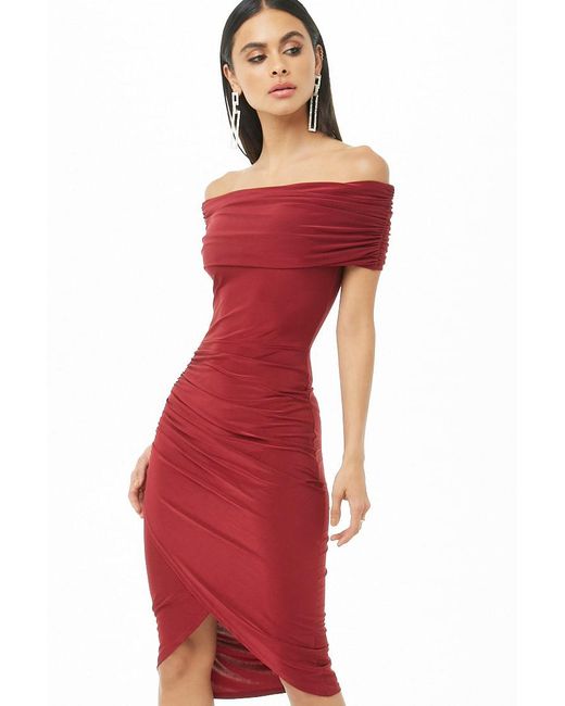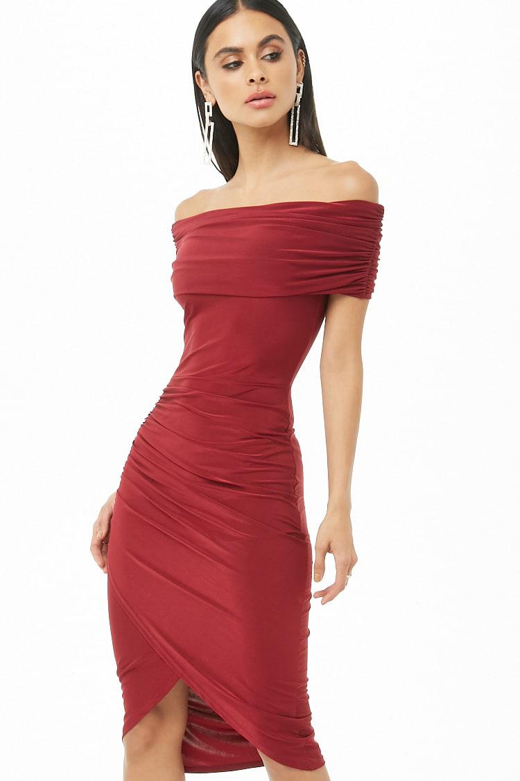 Dettagli Vestito al ginocchio con scollo omerale con ruche, maniche corte, vita raccolta e orlo a tulipano. Colore: rosso