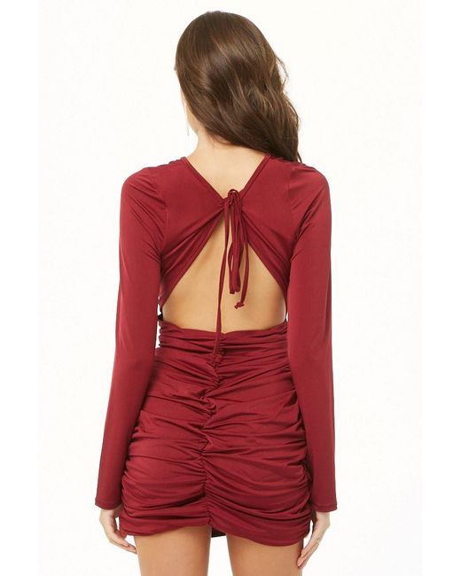 Dettagli Vestito corto aderente effetto lucido con lacci con cut-out sul retro, ruche sui lati, maniche lunghe e scollo rotondo. Colore: rosso