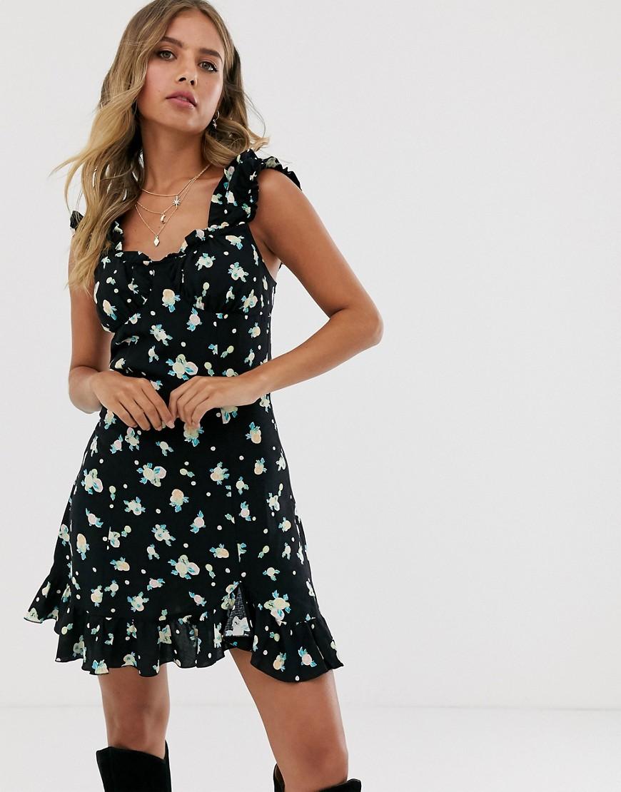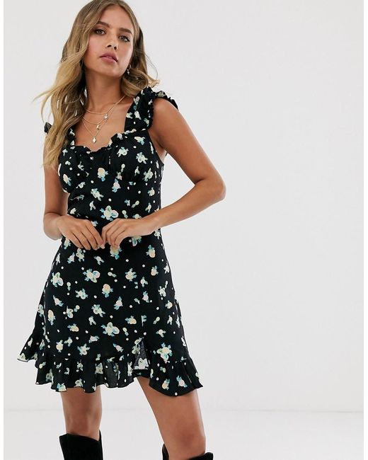 Vestito di Free People, Per il tuo abbigliamento da giorno, Scollo squadrato, Maniche a volant, Stampa floreale, Nodo posteriore, Vestibilità classica, Scegli la tua taglia normale. Con radici legate agli anni '70, la ragazza Free People vive tra arte, moda, musica e voglia di viaggiare. Femminile nello spirito e "Bohémien" negli atteggiamenti. Dallo stile dolce al duro, da quello maschiaccio al romantico, Free People mischia colori e stampe per una collezione ispirata di vestiti lunghi fluttuanti, maglie in jersey morbidissimo e stivaletti di pelle. Jersey/ lino/ pelle/ stampa/ viscosa. Colore: nero