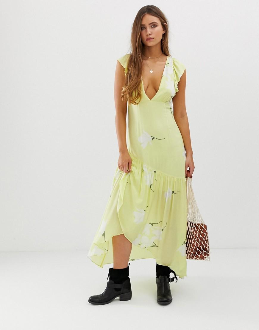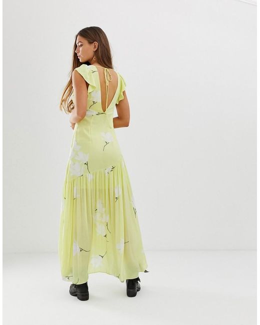 Vestito lungo di Free People, Dillo con i fiori, Scollo profondo, Bordi arricciati, Fondo raccolto, Nodo posteriore, Chiusura con zip laterale, Vestibilità classica, Veste perfettamente la taglia indicata. Con radici legate agli anni '70, la ragazza Free People vive tra arte, moda, musica e voglia di viaggiare. Femminile nello spirito e "Bohémien" negli atteggiamenti. Dallo stile dolce al duro, da quello maschiaccio al romantico, Free People mischia colori e stampe per una collezione ispirata di vestiti lunghi fluttuanti, maglie in jersey morbidissimo e stivaletti di pelle. Jersey/ pelle/ rayon. Colore: giallo