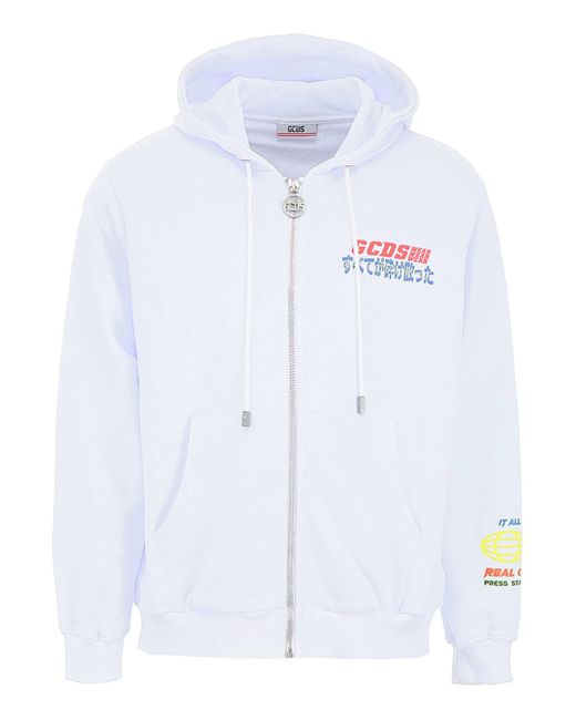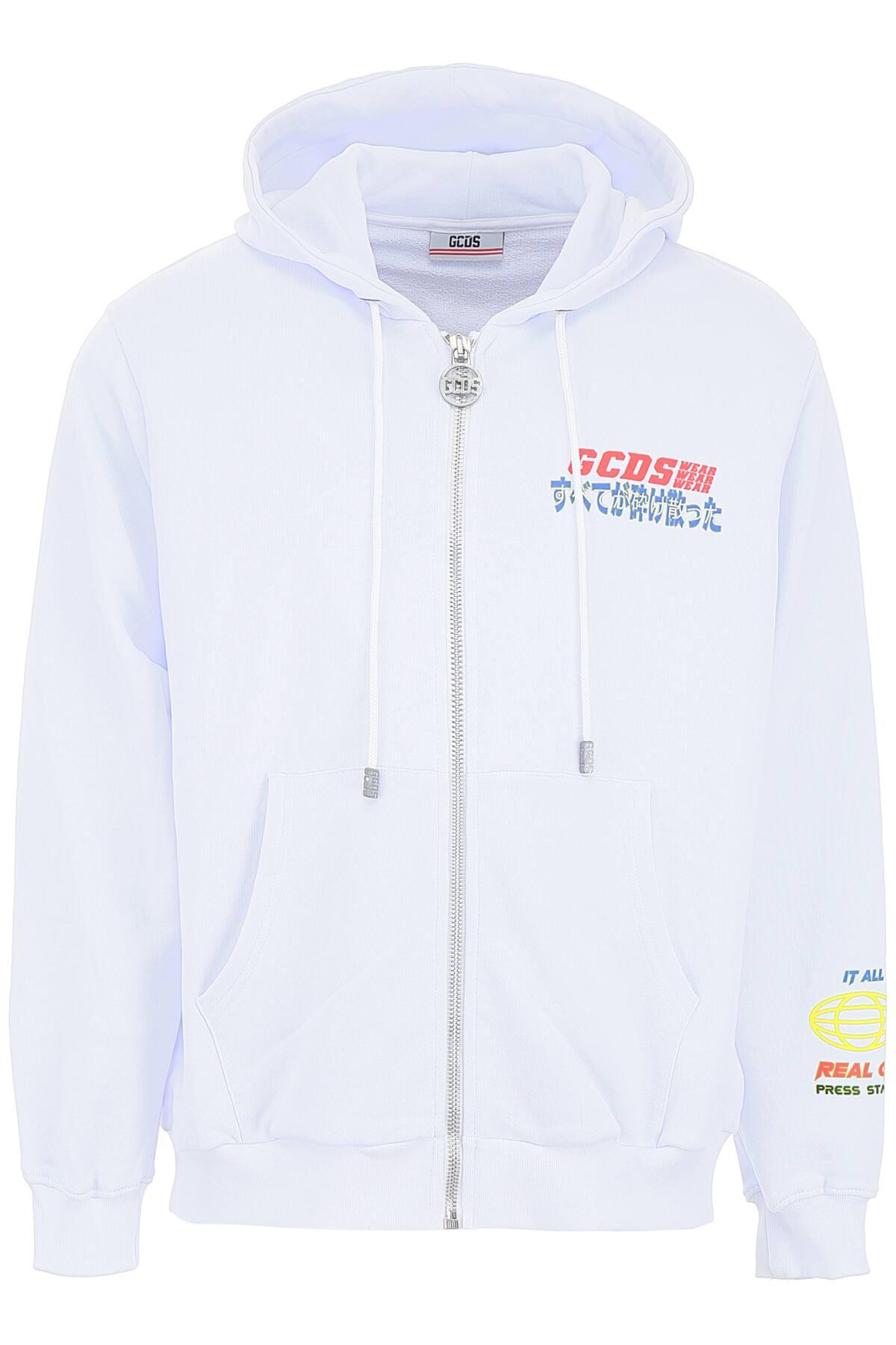 Felpa GCDS con chiusura con zip sul davanti, realizzata in jersey di cotone con interno garzato e caratterizzata da stampa logo e caratteri giapponesi multicolor sul davanti, sul pannello posteriore e sulla manica. Il capo dal fit oversize presenta una coulisse sul cappuccio, tasche a marsupio e finiture a costine. Il modello è alto 182 cm e indossa la taglia M. Colore: bianco