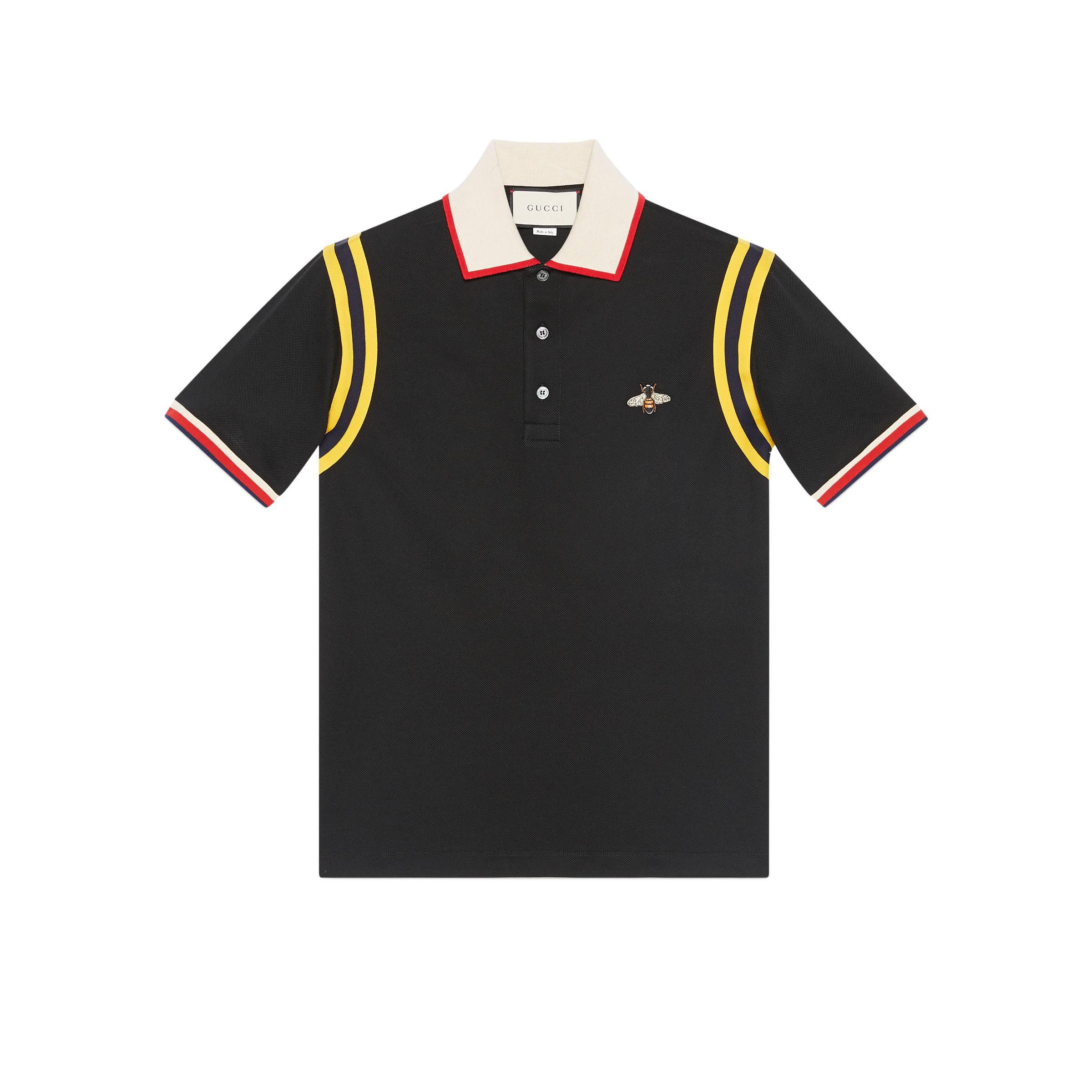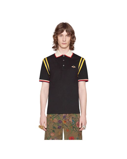 Tra i simboli riaffiorati dagli archivi storici della Maison, l'ape, introdotta per la prima volta negli anni '70, è ricamata sulla parte frontale di questa polo in cotone con colletto e fondo manica a contrasto. Inserti a righe nere e gialle enfatizzano le spalle e rimandano all'ispirazione atletica della collezione Cruise 2018.;Piquet di cotone stretch nero ;Colletto bianco con finiture rosse; Applicazione ape ricamata; Paramontura con bottoni in madreperla; 93% cotone e 7% elastan; Made in Italy; Il modello è alto 188cm e indossa la taglia M.