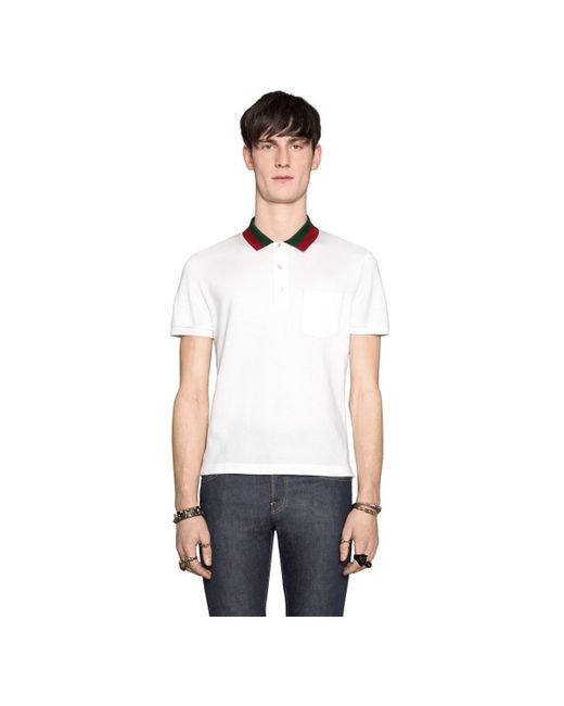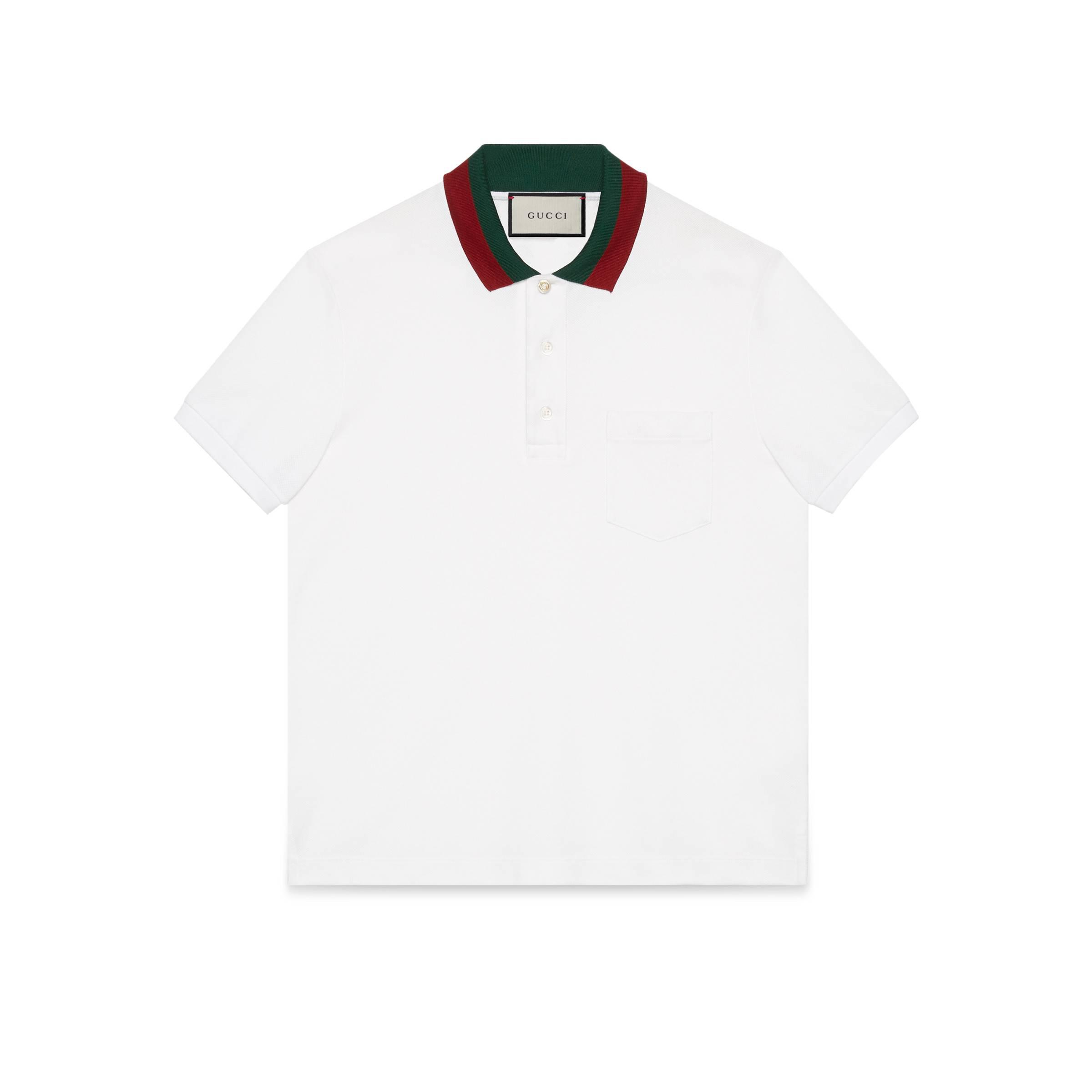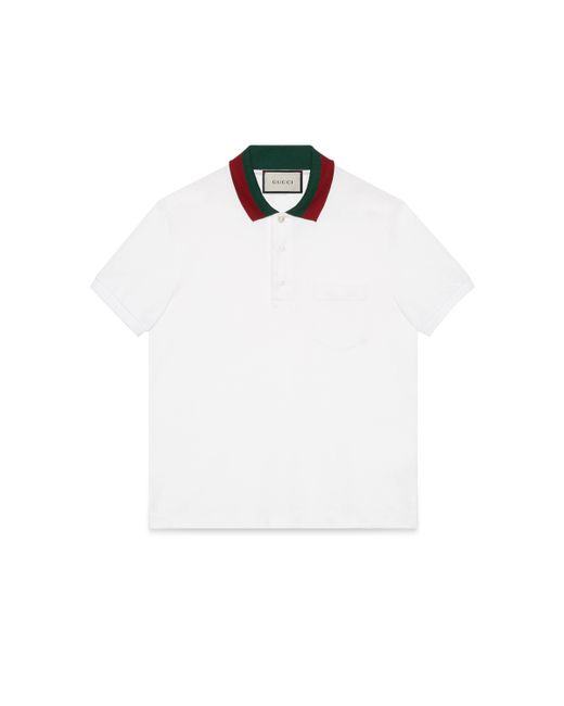 Polo in cotone bianco piquet con colletto Web di Gucci. Elemento inconfondibile della Maison Gucci, il dettaglio Web continua a contraddistinguere con forza le creazioni di Alessandro Michele. In questo caso compare nella classica combinazione verde e rosso su base in cotone stretch. Paramontura con bottoni e colletto con bottone GG in madreperla. 93% cotone e 7% lycra. Made in Italy.