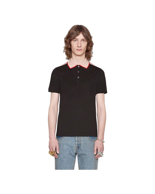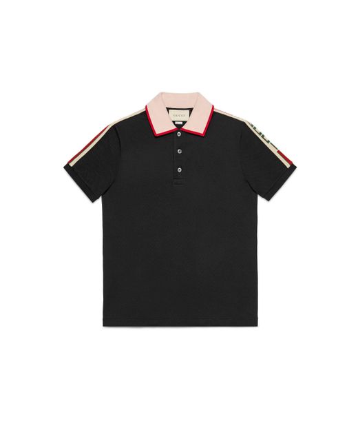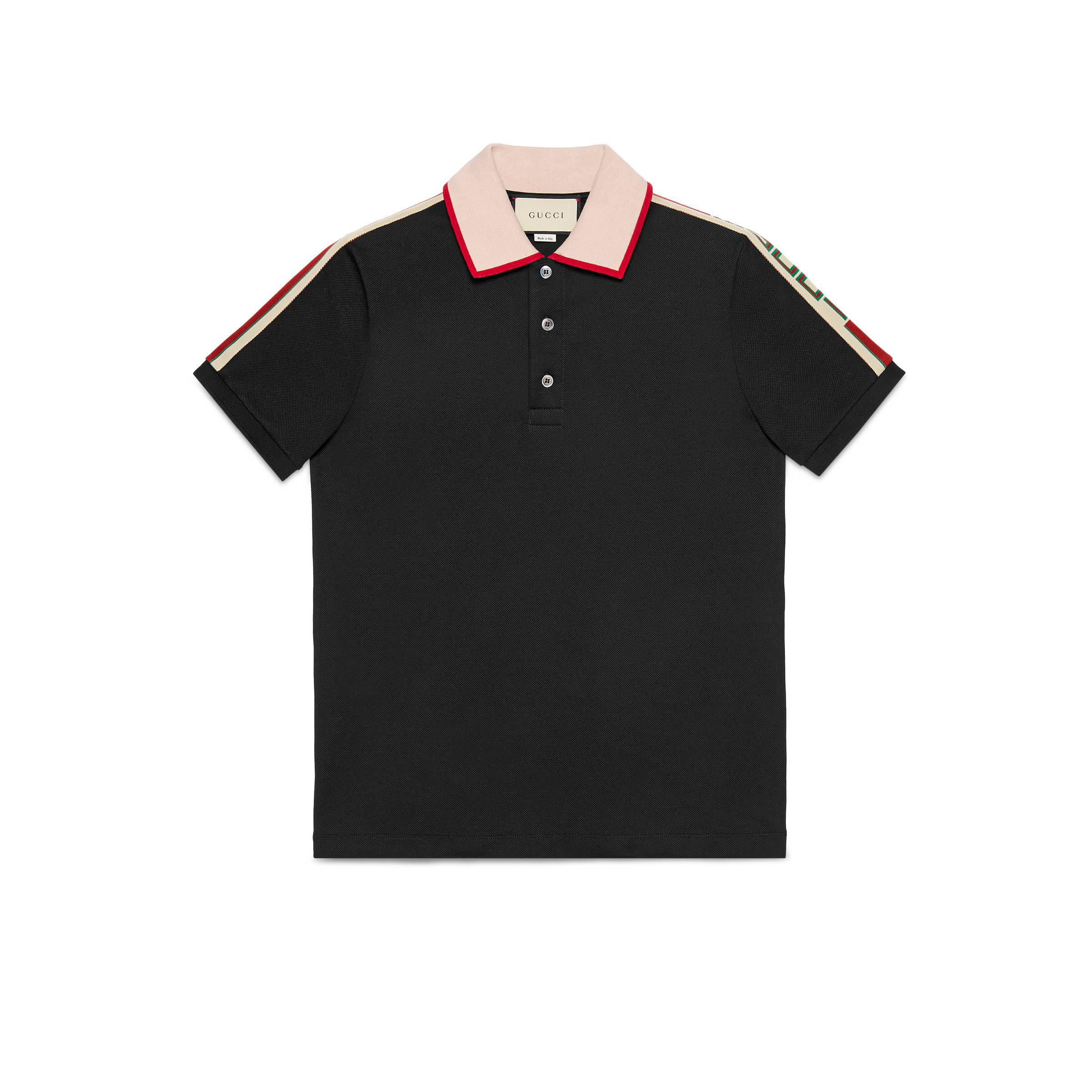 In un mix di ispirazione preppy e richiami al mondo dello sportswear, questa polo blu con colletto a contrasto è caratterizzata dal nastro gucci jacquard che orna le maniche e rimanda alle maglie sportive rétro. Piquet di cotone stretch nero. Colletto bianco con finiture rosse. Nastro gucci jacquard sulle maniche. Paramontura con bottoni in madreperla. 93% cotone e 7% elastan. Fabbricato in italia. Il modello è alto 188cm e indossa la taglia m. RTW. Colore: nero