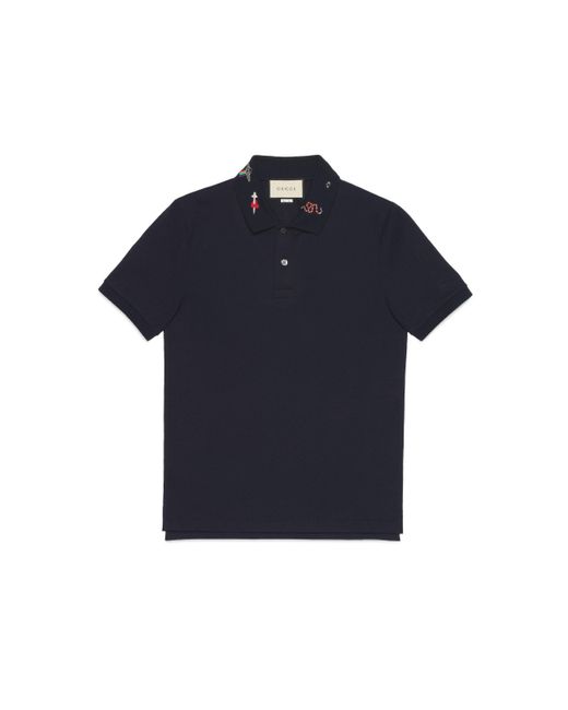 In piqué di cotone blu, la polo è arricchita dai simboli caratteristici della maison ricamati lungo il colletto. Ispirato allo stile preppy nato nelle scuole della ivy league, questo modello rievoca l'atmosfera dei corridoi universitari. Piquet di cotone stretch blu con simboli gucci ricamati sul colletto. 93% cotone e 7% elastan. Fabbricato in italia. Il modello è alto 188cm e indossa la taglia m. RTW. Colore: blu