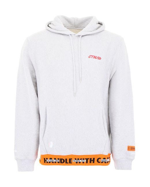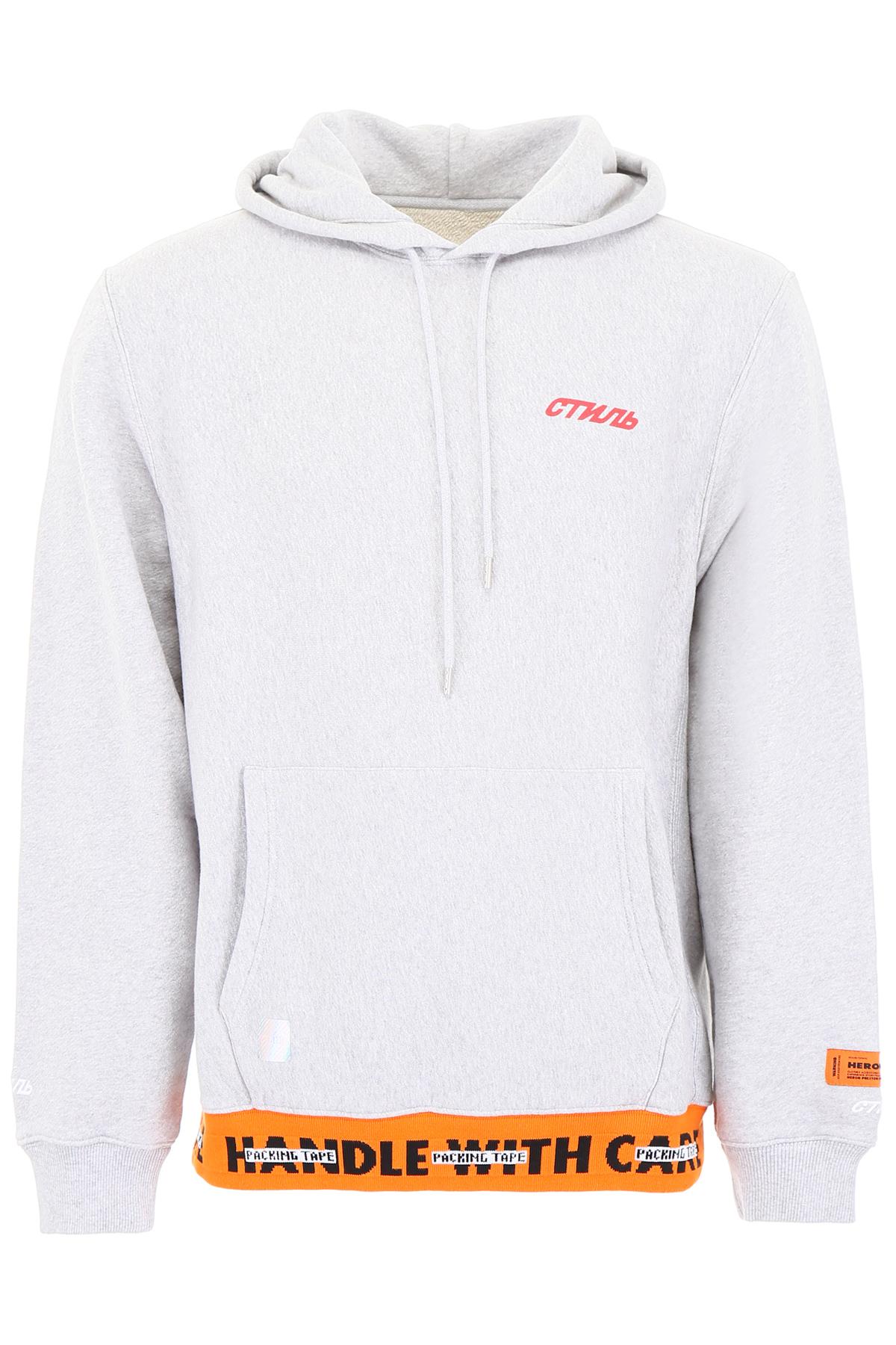 Felpa oversize Heron Preston in jersey di cotone caratterizzata da fondo a contrasto con scritta jacquard "Handle with care". Cappuccio con coulisse, tasca frontale a marsupio, ricamo e stampa "CTNMB" sul fondo delle maniche e sul davanti, nastro con logo jacquard applicato sul retro, patch logo sulla manica sinistra, inserti laterali e polsi a costine micro. Il modello è alto 182 cm e indossa la taglia M. Colore: grigio