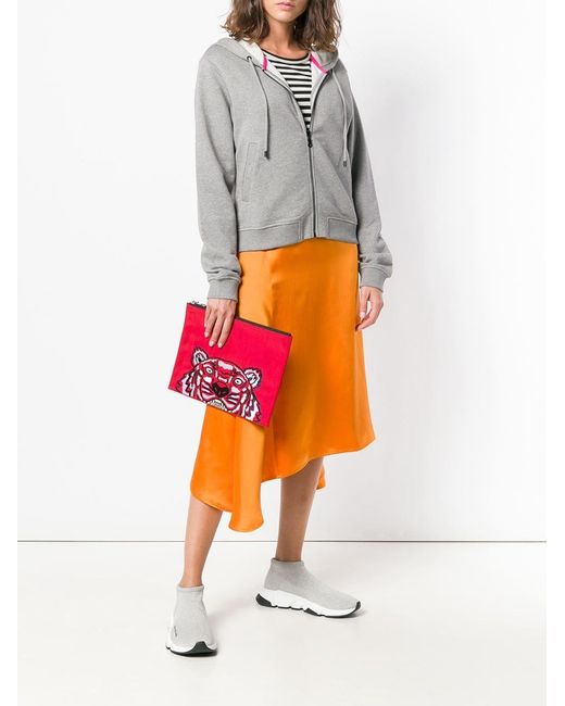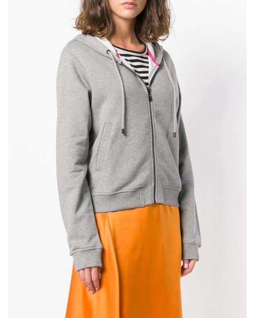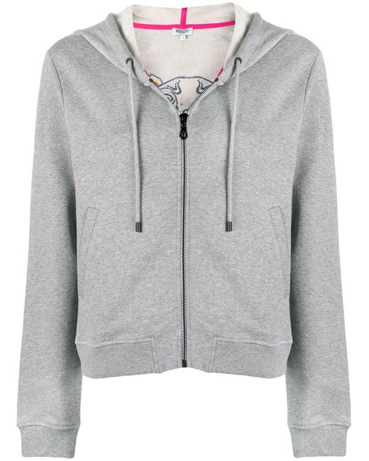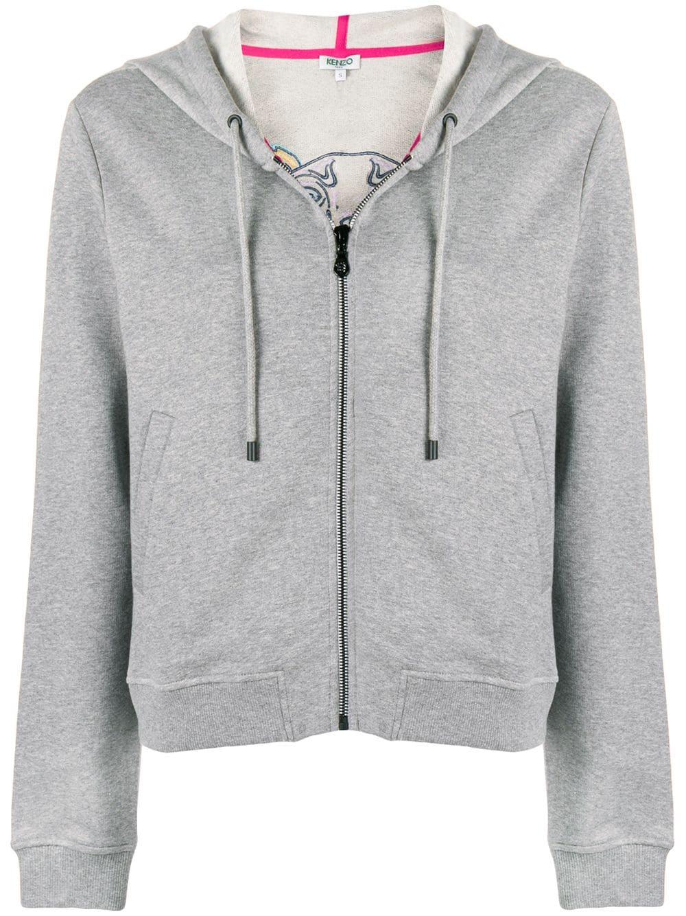 Felpa con cappuccio di colore grigio in cotone di Kenzo. Modello con cappuccio con cordoncino, chiusura con zip frontale, tasche a canguro, manica lunga, orlo e polsini a coste e logo applicato sul lato posteriore. Colore: grigio