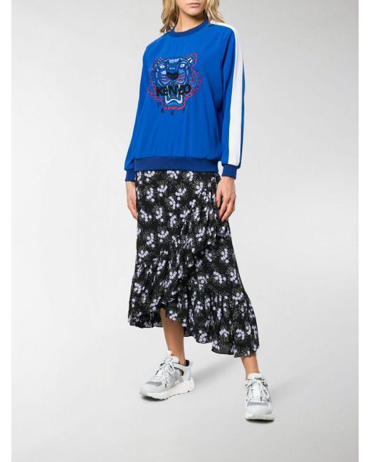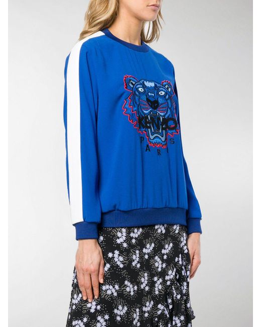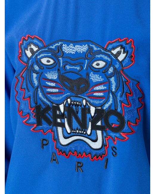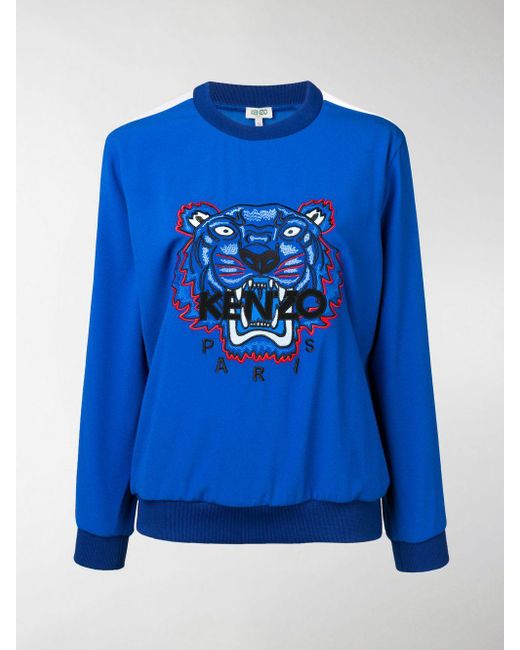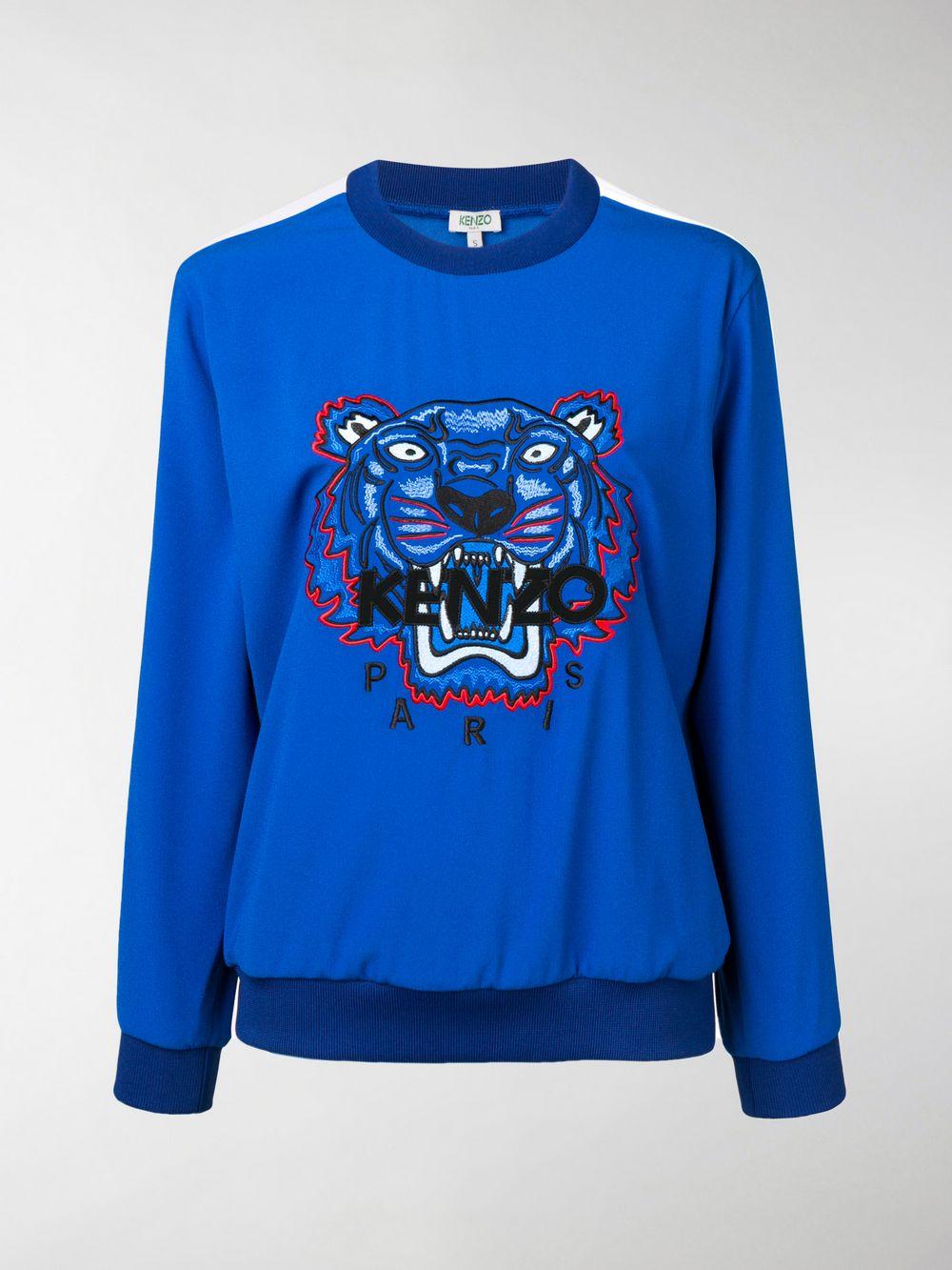 Felpa con pannelli Tiger di colore blu di Kenzo. Modello con manica lunga, orlo e polsini a coste, girocollo e logo designer ricamato sul petto. Colore: blu