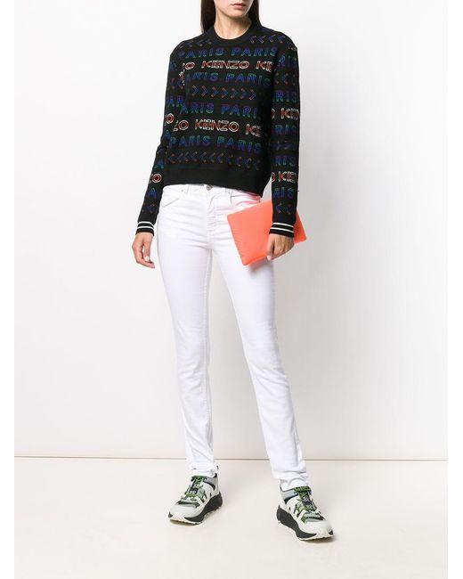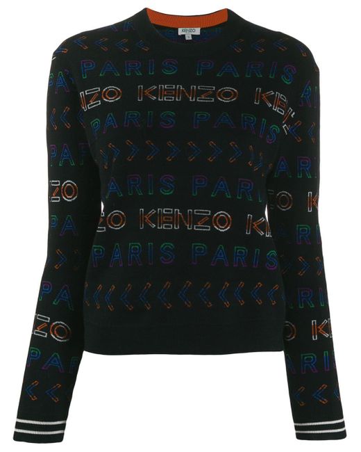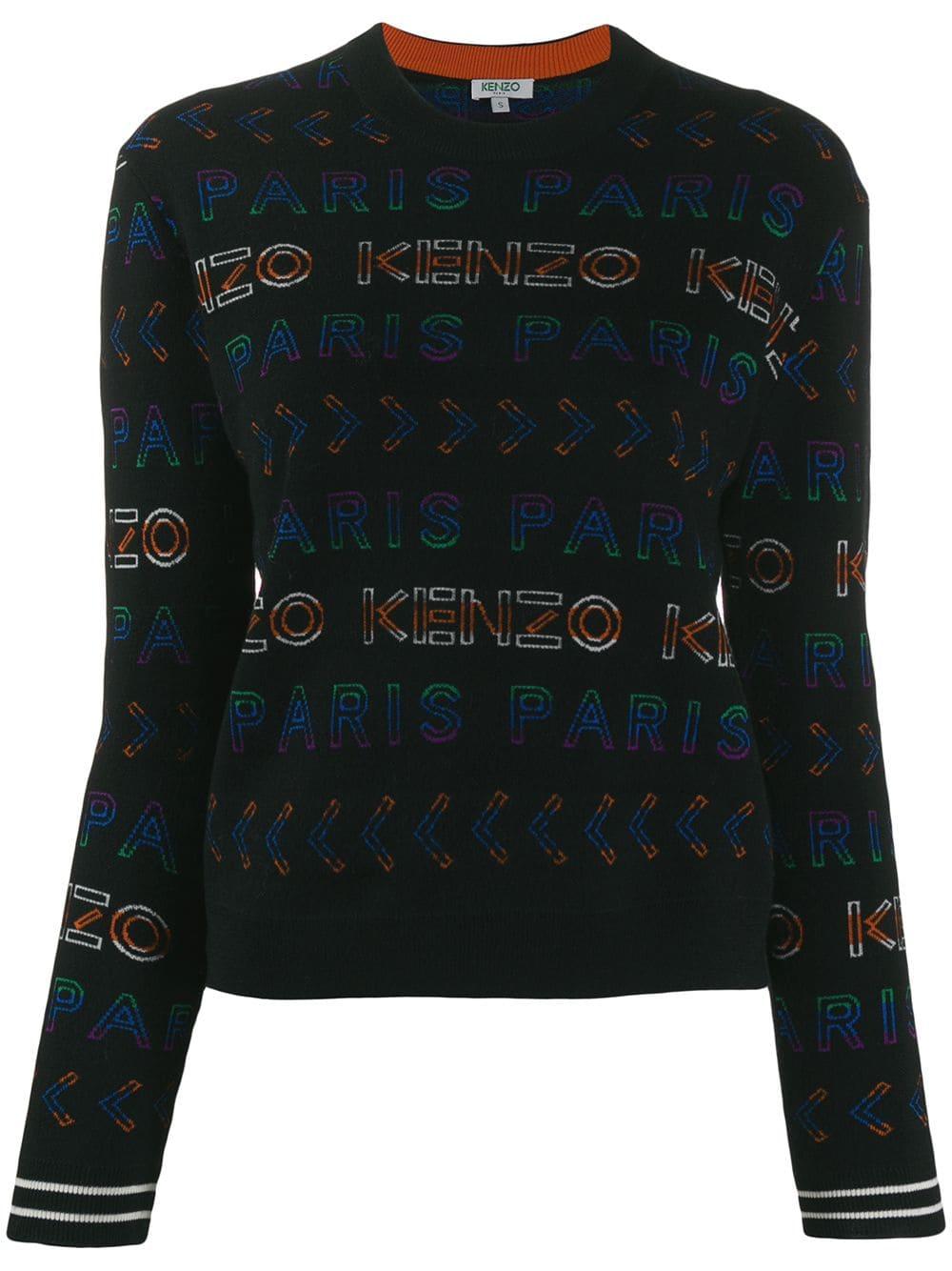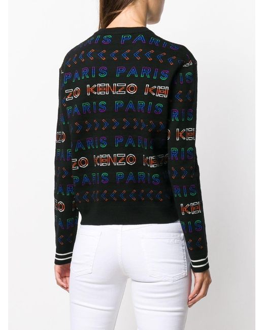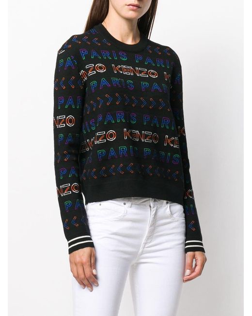 Felpa girocollo in misto lana di Kenzo a maniche lunghe con orlo e polsini a coste e ricami multicolore del logo all-over. Colore: nero