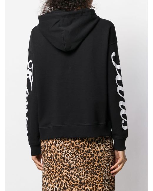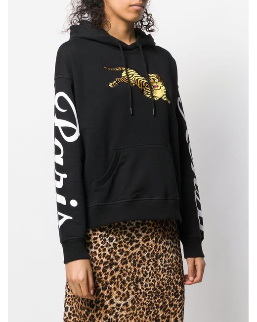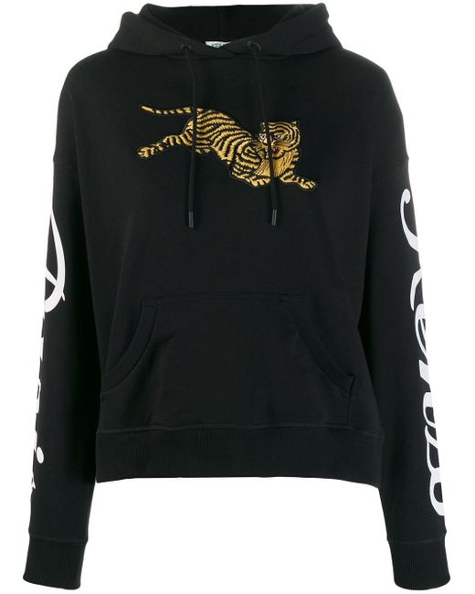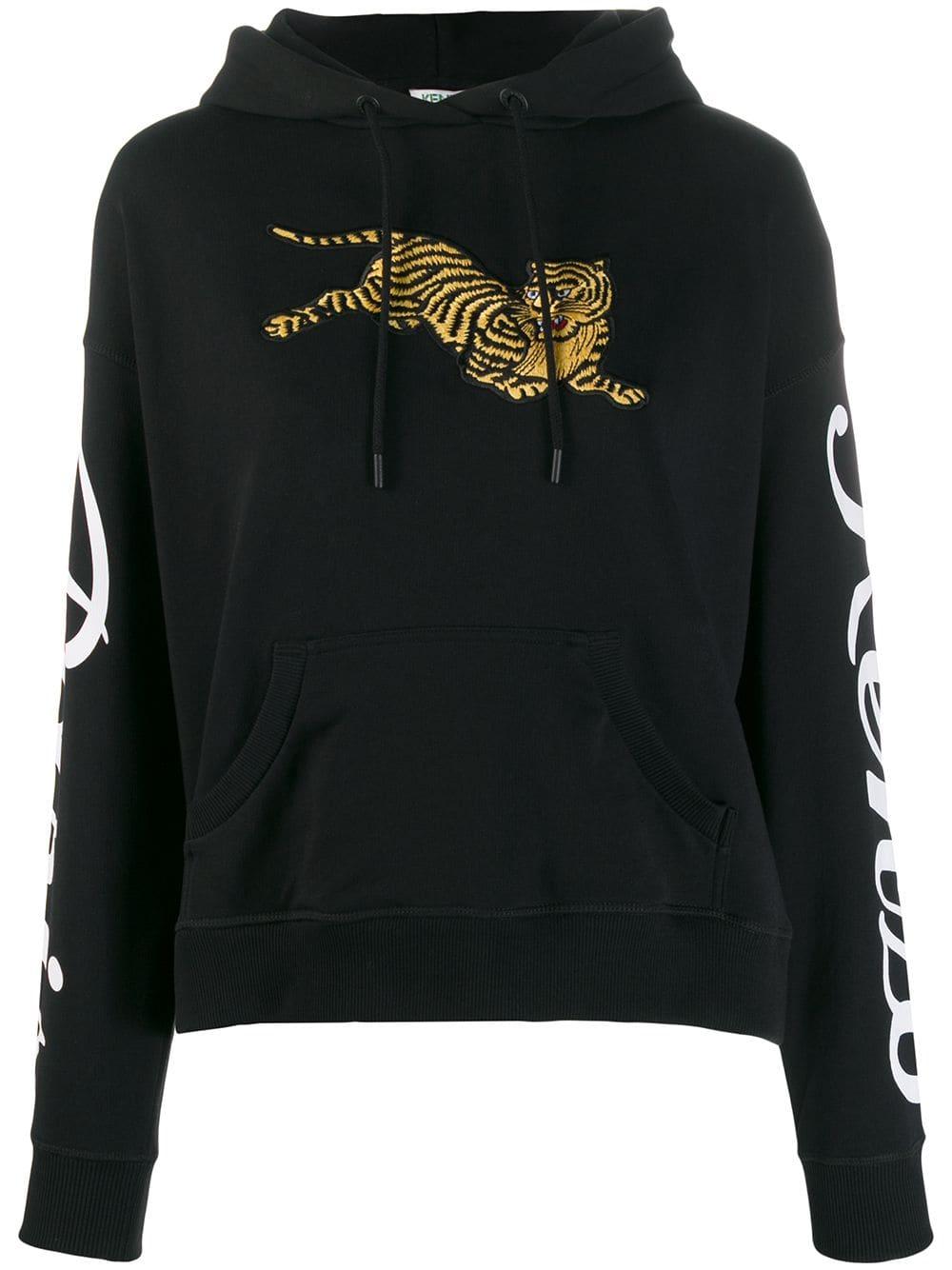 Felpa girocollo 'Tiger' di Kenzo a maniche lunghe con orlo dritto, tasca marsupio sul davanti, orlo e polsini a coste, cappuccio con coulisse, stampa sulle maniche, ricamo sul petto. Colore: nero