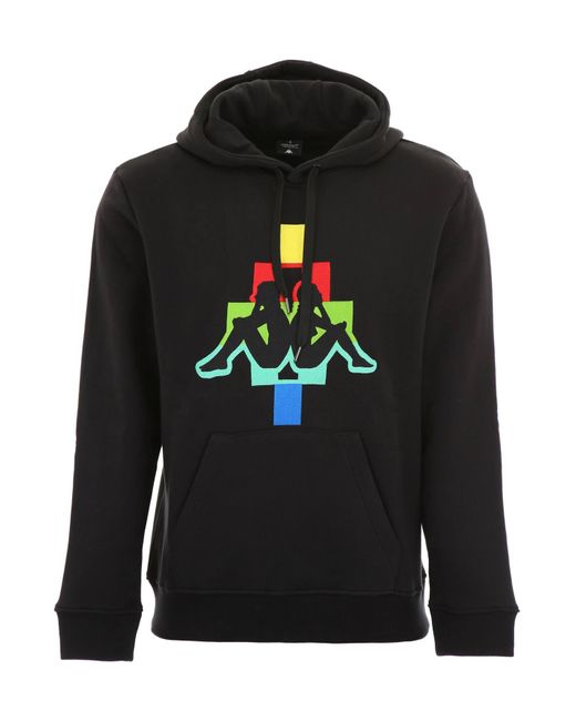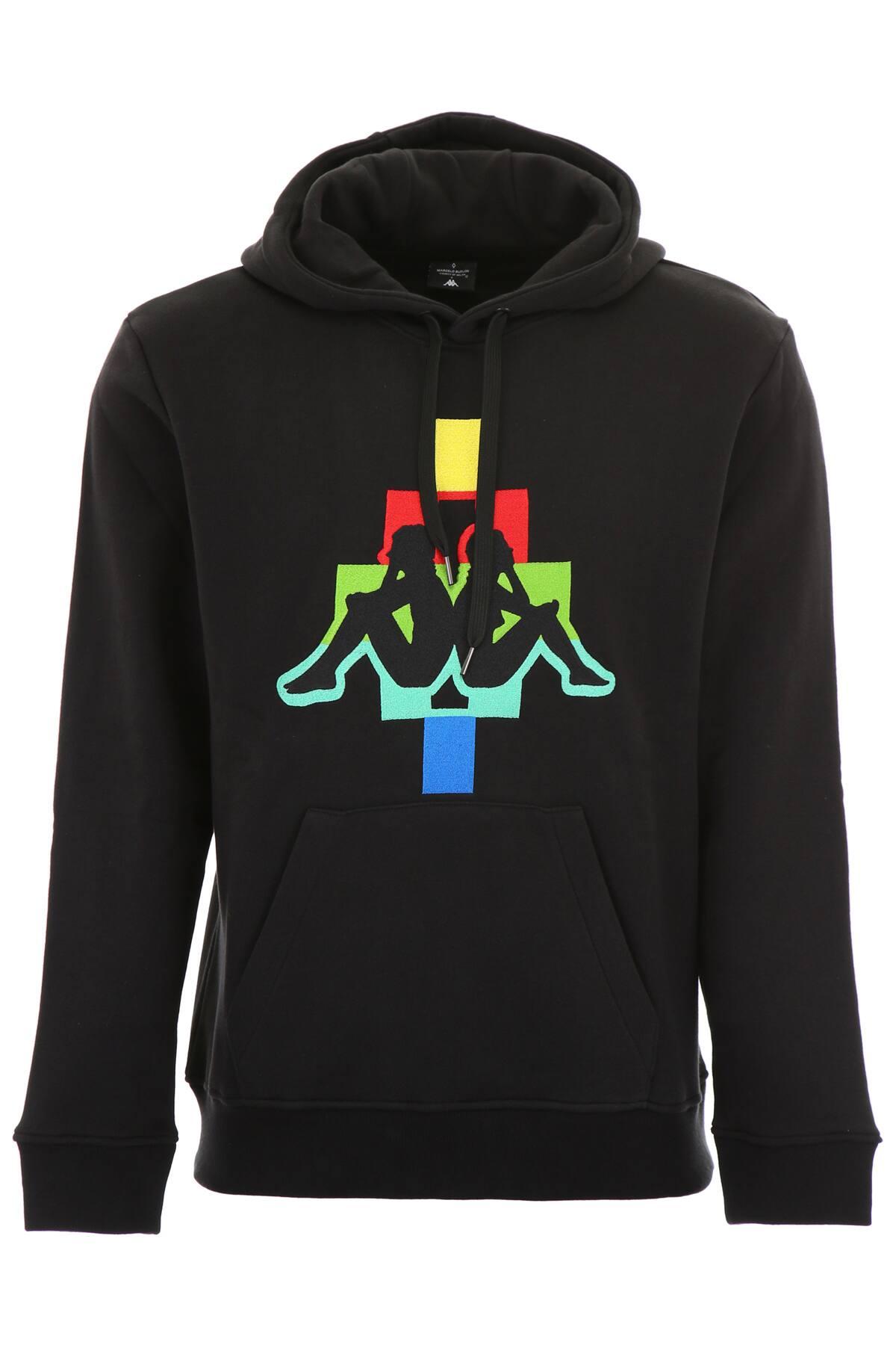 Felpa Marcelo Burlon in morbido cotone con cappuccio e coulisse. Presenta maxi ricamo Kappa multicolor sul davanti, polsi e fondo a costine. Il modello è alto 184 cm e indossa la taglia M. Colore: nero