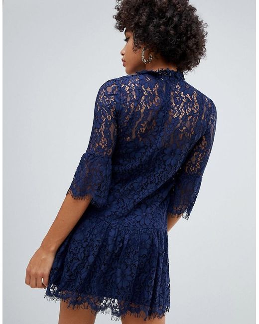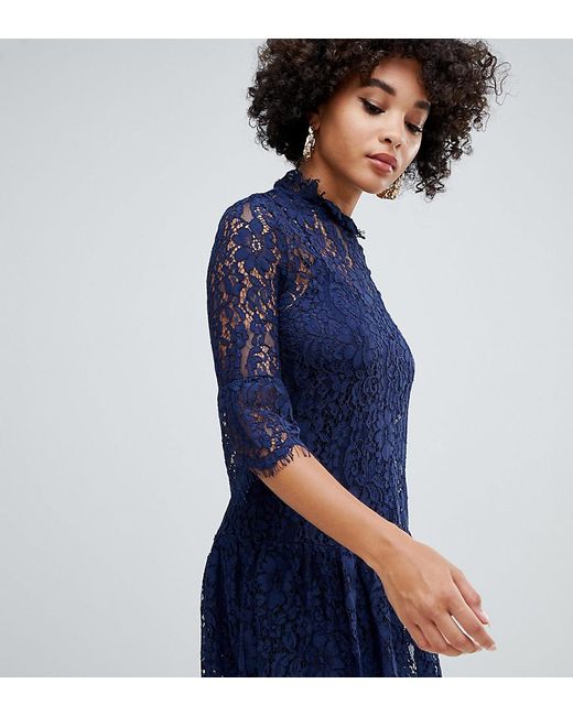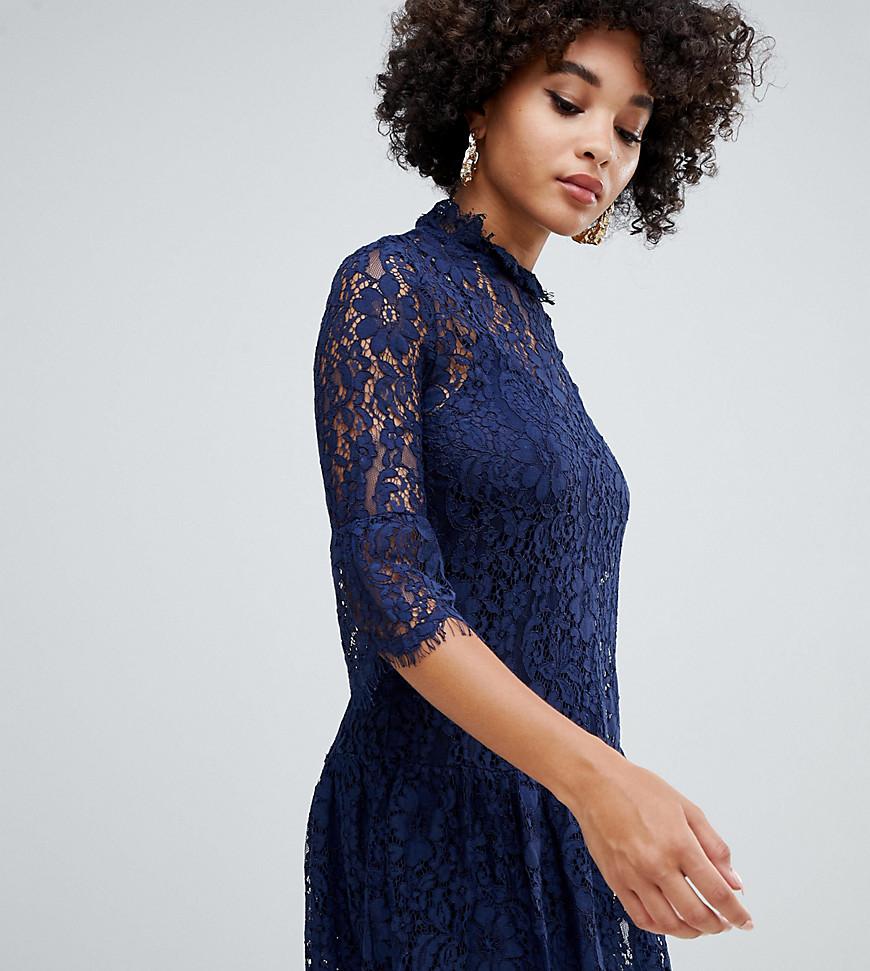 Vestito a trapezio in pizzo blu navy con volant da donna