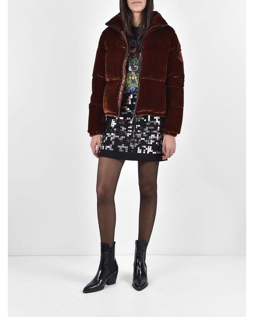Collo alto. Chiusura frontale con zip. Due tasche laterali. Interno di piuma d'oca. La modella indossa la taglia 1.. 82% Viscosa 18% Seta. Colore: multicolore