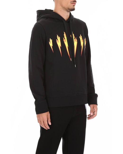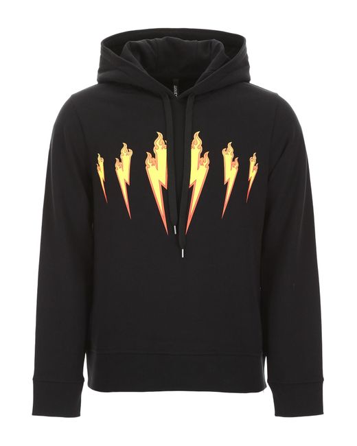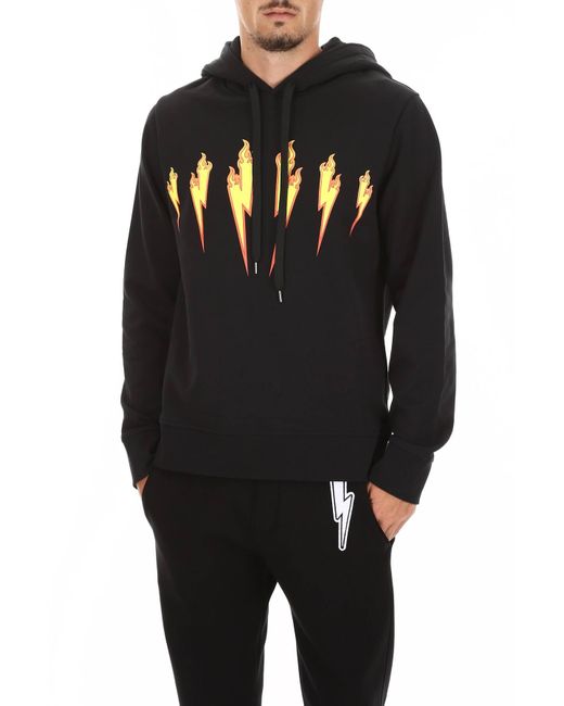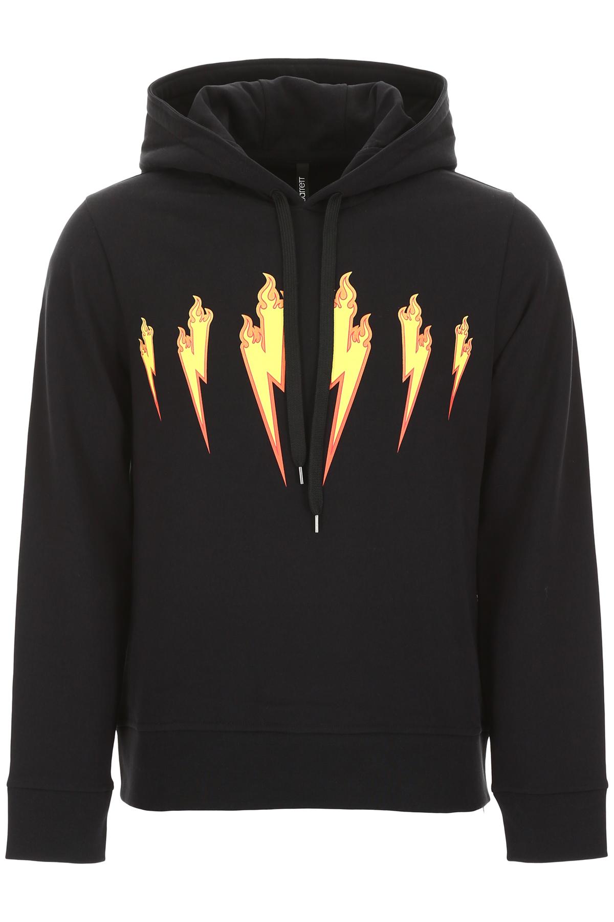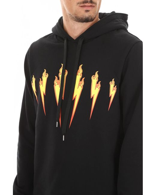 Felpa NEIL BARRETT in jersey di cotone dal fit regolare, caratterizzata da stampa "thunder flames" a contrasto sul davanti. Presenta coulisse sul cappuccio e finiture a micro costine elasticizzate. Il modello è alto 182 cm e indossa la taglia M. Colore: nero
