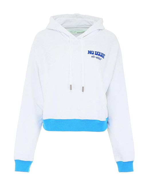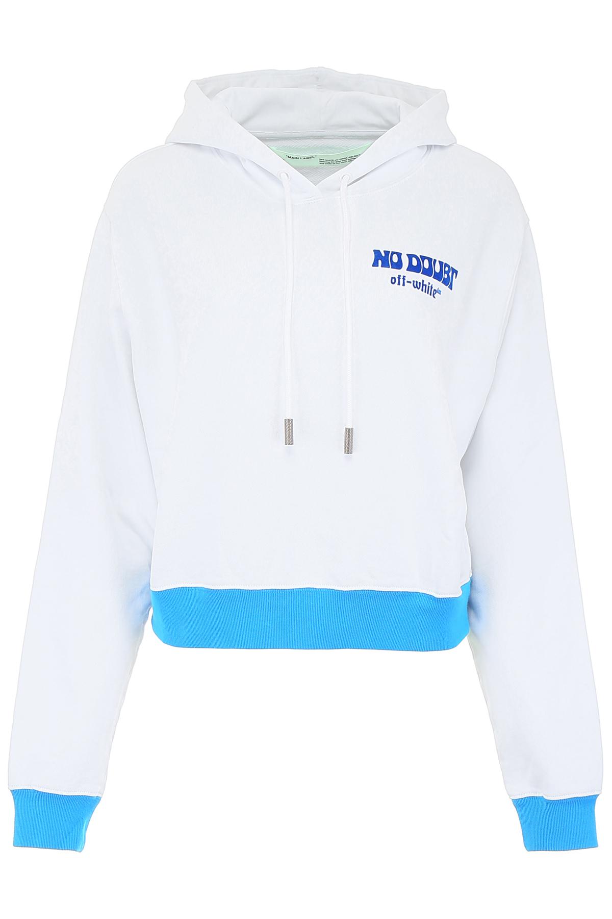Felpa OFF-WHITE con cappuccio e coulisse, caratterizzata da stampa floccata "No Doubt" sul davanti e stampa "Woman" sul retro. Presenta un fit rilassato a spalla scesa e finiture a micro costine elasticizzate a contrasto. La modella è alta 177 cm e indossa la taglia S. Colore: blu