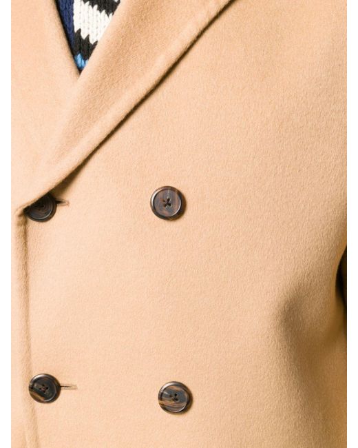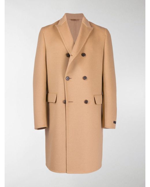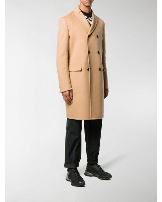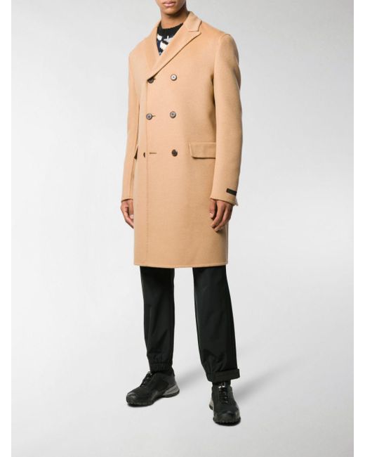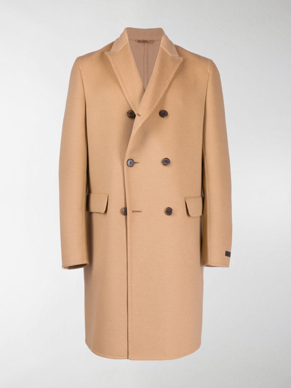 Cappotto doppiopetto midi color cammello in misto lana di Prada. Modello con colletto con bavero classico, chiusura a doppiopetto, maniche lunghe, polsini con bottone, tasche frontali con patta, spacco posteriore e orlo dritto. Colore: neutro