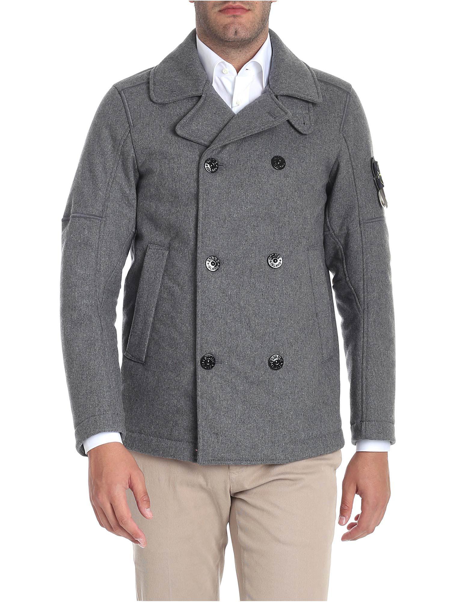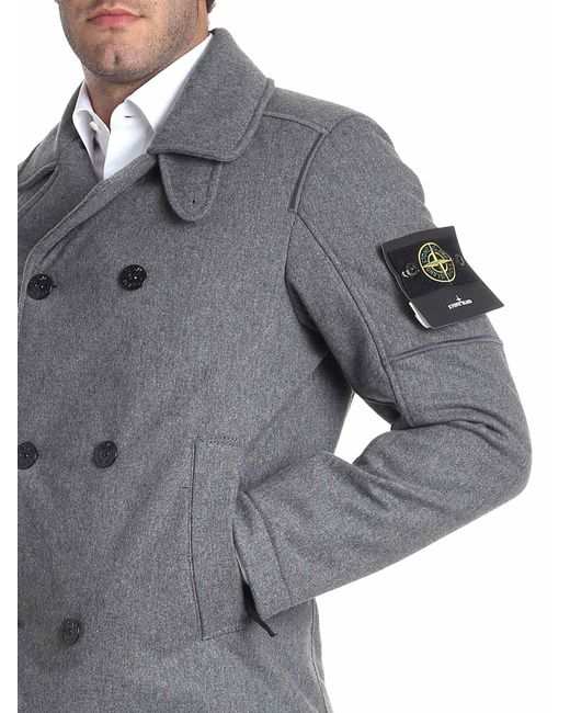 Cappotto doppiopetto in misto lana. Colore: grigio melange. Tasche laterali con zip. Dettaglio logo removibile sulla manica. Revers classico.